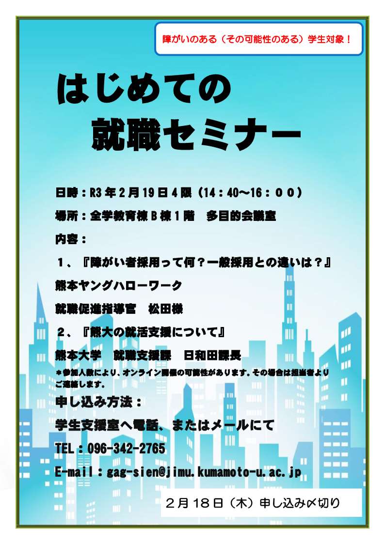 2020年度 【就活】虎扑nba直播,虎扑体育感染症拡大地域への移動自粛について 【企業様向け】就職活動における虎扑nba直播,虎扑体育感染症拡大地域への移動自粛に関して協力のお願い 【就活】虎扑nba直播,虎扑体育感染症拡大地域への移動自粛の解除について 夏期インターンシップ参加に係る虎扑nba直播,虎扑体育への対応について 【就活】2022年卒向け就職ガイダンス(企業就職向け)の公開について 【就活】就職活動やインターンシップ等への参加に伴う移動について 【就活】2021年卒向け就活RE☆STARTガイダンスの公開について 【就活】2022年卒向け 就職準備講座(企業就職向け)の公開について 【就活】ZoomによるOWN就活アドバイス会を実施しました 【就活】(全学年対象)11/25 キャリア啓発セミナーJob Studyの開催 【就活】2022年卒向け業界研究講座の開催 12/1~ 【就活】(障がいのある(その可能性のある)学生対象)はじめての就職セミナーの開催について 就活セミナーポスター.jpg