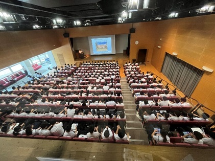 講話を聞く附属中学校生写真